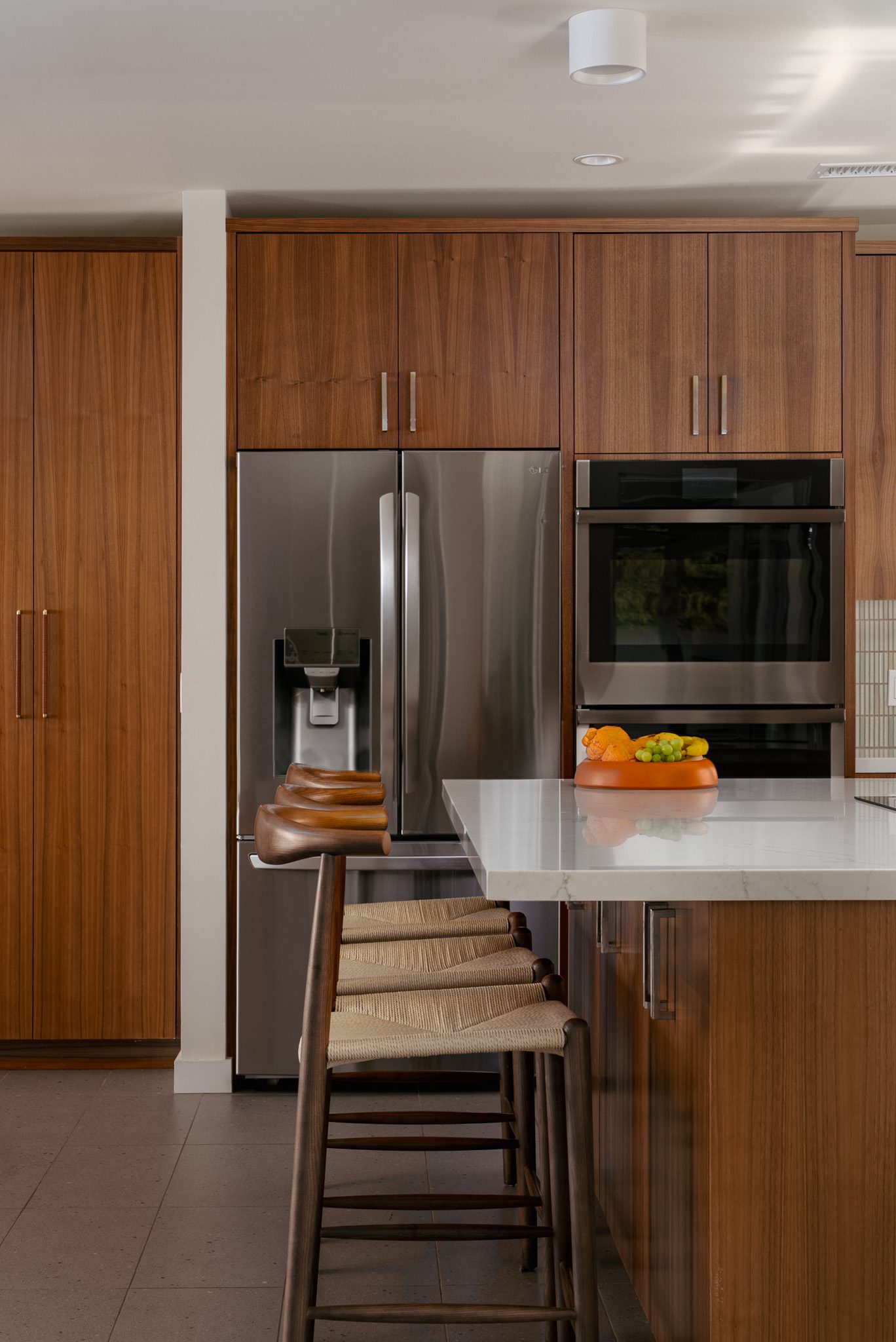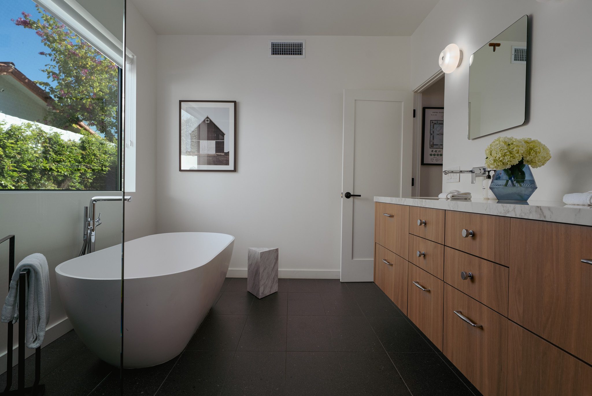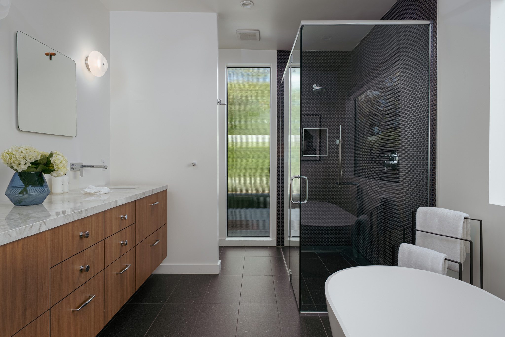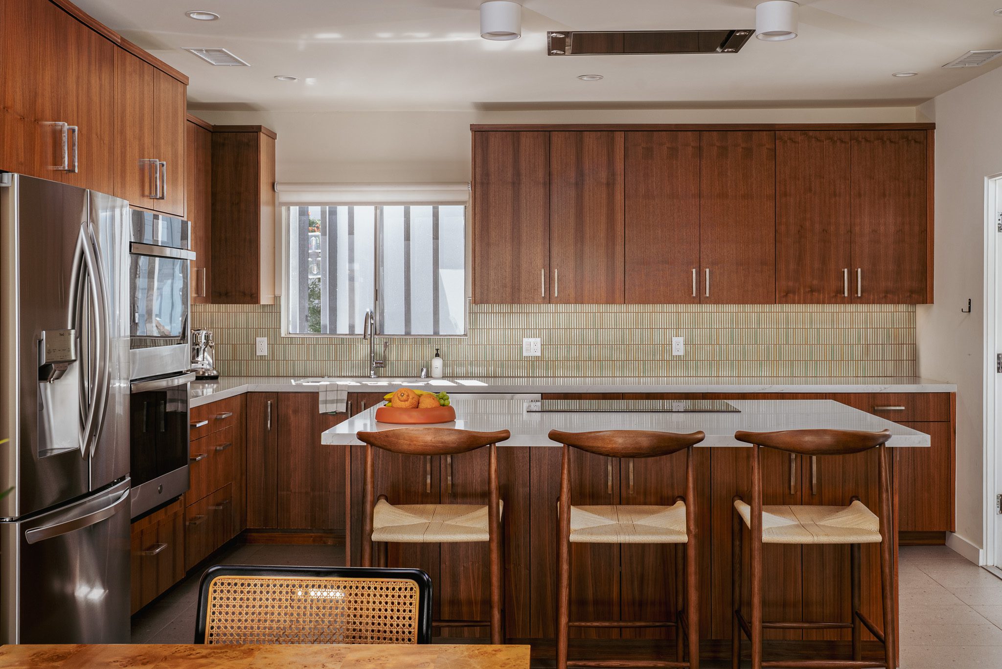 Logo for T&M Builders and Design Inc., featuring a stylized red “T” and “M” with a hammer design. Background includes a house silhouette with architectural lines.